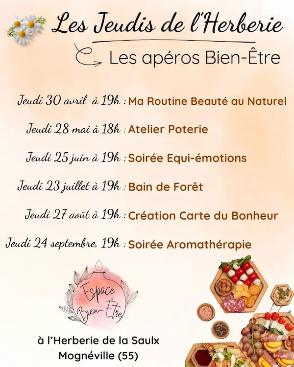 Les professionnels de l’Espace bien-être vous proposent des soirées bien-être à l’Herberie ou en pleine nature une fois par mois. Ces moments pour soi où le temps est suspendu, et où on vous emmène en voyage intérieur se terminent par un apéritif local et de saison… Pourquoi ne pas se faire plaisir ?