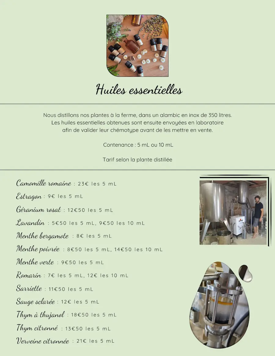 Les huiles essentielles que nous avons actuellement : camomille romaine, estragon, géranium rosat, lavandin, menthe bergamote, menthe poivrée, menthe verte, romarin, sarriette, sauge sclarée, thym à thujanol, thym citronné, verveine citronnée