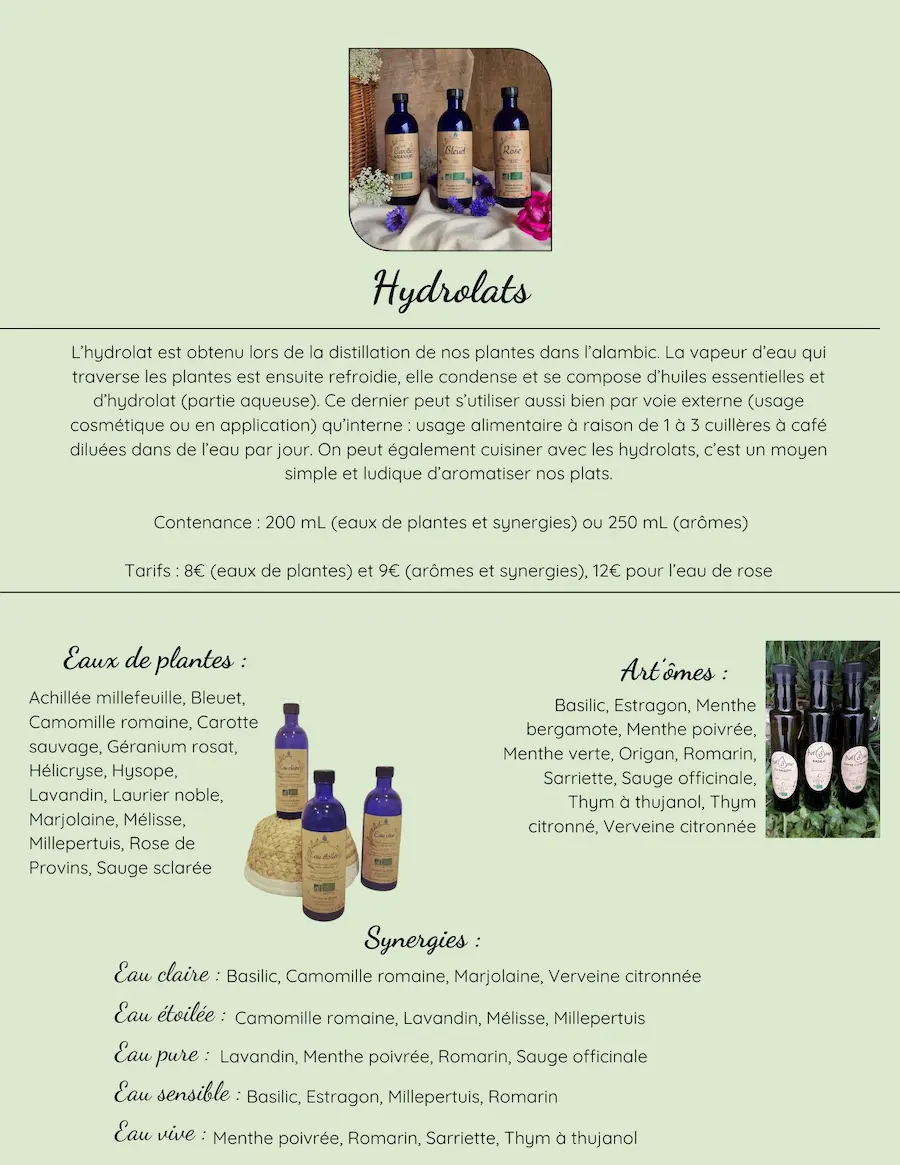 Les hydrolats sont connus pour leurs vertus culinaires (eau de rose, eau de fleurs d’oranger), ils ont aussi des qualités de bien-être intéressantes. Ils peuvent avoir un parfum plus ou moins prononcé avec des notes florales ou plus herbacées.